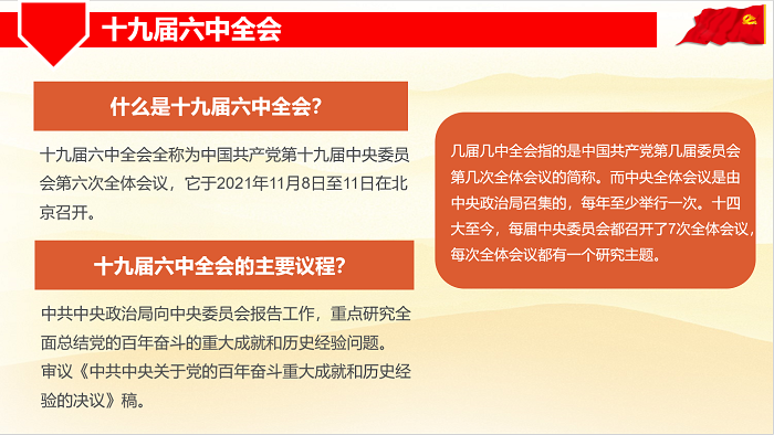 之后,单旭鑫同志为大家普及了“十九届六中全会”的含义、主要议程等知识。同志们也学习到了“几届几中学会”表示什么,每几年举办一次等等。