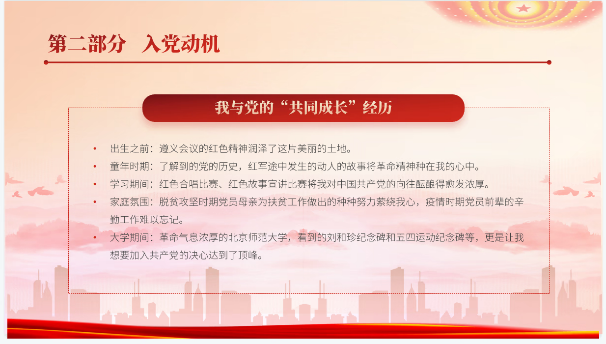接着,唐风华、崔傲荃等入党积极分子开始答辩,介绍各自的入党动机与社会实践活动、志愿活动的参与情况,表现自身思想上的进步,并认真进行了自我评价。在各位积极分子答辩之后呈现自己的评审表,参会的党员和预备党员同志针对评审表的排版、内容等方面提出了具体的改进意见并对各个积极分子的答辩表现进行打分。
