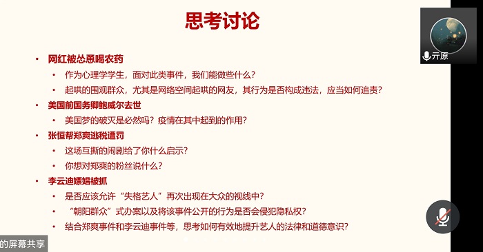 2021年10月31日晚6点,欧洲杯 本科生党支部第二党小组十月党小组会以线上形式顺利召开。会议由党小组组长单旭鑫同志主持,两个汇报小组分享时事,共63名同志参与学习并讨论。 会议内容第一项,全体起立,奏唱国际歌。 会议内容第二项,汇报小组向与会同志分享时事。刘彦君、程先楷、叶红爱、谭静文小组针对纪念辛亥革命110周年大会,做“铭记历史开创未来,祖国必须统一也必然统一”专题分享,指出祖国统一符合包括台湾同胞在内的全体中华民族的整体利益,祖国统一的历史任务一定要实现、祖国统一的历史任务一定能实现!接着,他们分享了华坪女子高中校长张桂梅的事迹。