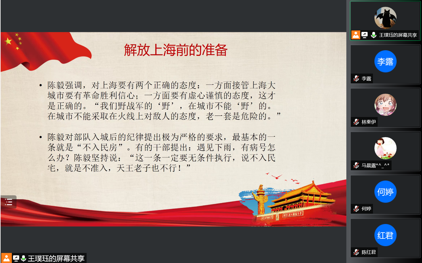 2021年11月3日下午4点,欧洲杯 研究生第九党支部与20级博士第二团支部共同开展线上党史学习教育活动。本次活动由20级博士第二团支部团支书王璞珏同学主讲,宣讲主题为《中国共产党解放上海》。 首先,王璞珏同学结合历史故事,详细地为大家介绍了中国共产党解放上海的历史背景、解放上海前的准备、解放上海的过程以及治理上海的措施。 随后,王璞珏同学还介绍了时任上海市市长陈毅对党史学习的看法,“强调党史学习,就是要大家思想解放,把自己的成就摆到整个国家经济建设上去。” 党团支部还为本次学习准备了后续的自主学习材料,以便全体党员、团员能够获得对解放上海的党史更严谨、全面、深刻的了解。本次线上专题党史学习活动生动有趣,通过解放上海历史背景、解放过程以及解放上海后的治理措施的介绍使得同学们感受到了党史学习的魅力,深刻地体会到了党史学习的意义。 供图供稿:欧洲杯 研究生第九党支部 |