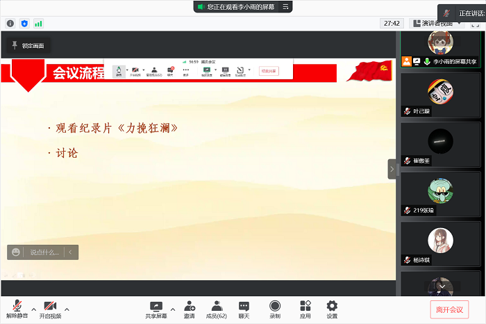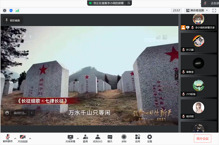 2021年10月31日晚6点,欧洲杯 本科生党支部第一党小组召开了10月份的党小组会。会议通过“腾讯会议”平台以线上会议的形式进行,由党小组组长李小雨同志主持,共58名成员参与。由于刚刚过去的10月22日是红军长征胜利85周年,因此,本次的组织生活会主题是观看长征纪录片《力挽狂澜》。 会议一开始,李小雨同志首先带领所有人一起奏唱了国际歌。 接下来正式开始观看纪录片《力挽狂澜》。 视频共三十分钟左右,用历史影像资料和一些老兵采访片段等还原了红军长征的前因后果。此外,纪录片还使用了多首《长征组歌》作为配乐,在《国际歌》主旋律的背景下,衬托出悲壮雄伟的氛围,传递了“不怕任何艰难险阻”的长征精神。其中的故事或令人振奋或感人肺腑,“雪线之上的墓碑,铭刻的是意志的海拔,信仰的标高。”给我们带来信仰的力量。 观看完毕后,大家分成小组进行讨论,互相交流体会与感受。 最后由宋佳忆和叶己璇同志代表各自的讨论组向大家分享了讨论结果。宋佳忆同志所在小组就“长征精神内涵”“长征精神在新时代的价值”以及“为什么长征的地位如此重要”这三个问题给出了相应的思考;叶己璇同志所在小组的组员结合各自在生活中的感受,就“长征精神及其意义”进行了讨论,并分享了观看纪录片之后的一些感悟。本科生党支部第一党小组10月份党小组会——《力挽狂澜》纪录片观看圆满结束。 欧洲杯 本科生党支部 供图供稿:叶己璇 |