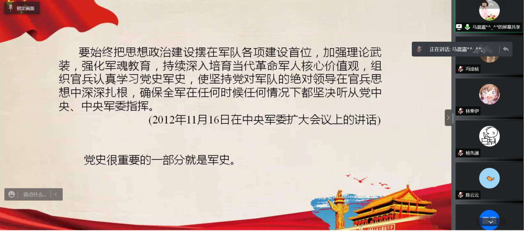2021年11月12日下午4点,欧洲杯 研究生第九党支部与20级博士二班团支部共同开展线上党史学习活动。本次活动由欧洲杯 研究生第九党支部组织委员马晨露为大家进行党史专题宣讲,宣讲主题为《中国人民解放军发展史》。
