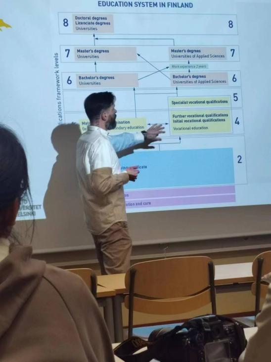 芬兰的教育体系给我留下了深刻的印象。芬兰被誉为世界上最成功的教育国家之一,他们注重培养学生的创造力、批判性思维和问题解决能力。在冬令营中,我亲眼目睹了他们独特的教育模式和课堂实践。通过对当地师范学校的参观和几场讲座的讲解,我大致对芬兰教育有了一个简单的认识。如果要用一个词来概括芬兰的教育,我不会选择“先进”、“完备”等诸如此类的字眼来夸耀其教育体系的优越性,我会选择一个自认为更为贴切的字眼,那就是“信任”。芬兰的教师注重培养学生的自主学习能力,给予他们更多的自由和负责任,并且重视学生的个性发展。这种尊重和信任的教育方式让我深受触动。在我看来,芬兰教育的一切都是建立在信任的基础上的。老师信任学生能够独立完成课业、学习知识,所以他们放任学生在任意喜欢的时间和地点完成作业;家长信任老师能够将学生教的很棒,所以他们几乎不会对老师有什么要求或苛责,并且认为每一所学校都是同等优秀的;领导信任老师能够出色地完成教育任务,所以他们不会对老师有任何考核或评分;政府信任学校的教育计划,所以他们为老师提供开展每一个活动的充足资金......一切的一切都源于信任,天然到让我有些难以置信。有太多环节仅仅依靠着人与人之间的彼此信任而开展,缺乏足够的预警和应对措施。也许是我的了解比较浅薄,但在我看来,想要钻空子或者使坏简直是一件太过容易的事。或许是他们的教育资金比较充足,或许是人口少的氛围,或许是北欧人民天然的性格特点等,这种信任简直到了一种不可思议的程度。 在师范学校的参观中,我们实地考察了芬兰学校课堂的真实情境。其实和国内并无太大差异,最大的区别也许是他们的课堂人数都非常少,寥寥无几,完全不似国内中学的满满当当。除此之外,我在她们身上看到了一种松弛感,她们的学习氛围是非常放松的,老师也非常包容,对那些有着奇思妙想的学生抱以鼓励的态度而非训斥。也许这也来源于其灵活多变的教育结构,学生们前往大学的方式是多种多样的,她们可以通过考试进入大学,也可以在中学阶段提交申请和佐证材料等,一切都是自由的、可选择的、灵活多变的。同时,芬兰的教育环境和资源也给我留下了深刻的印象。他们注重为学生创造舒适和安全的学习环境,学校设施完善,图书馆资源丰富,各种教学工具和技术设备齐全。这种良好的学习环境为学生提供了更多的学习机会和资源,激发了他们的学习兴趣和动力。