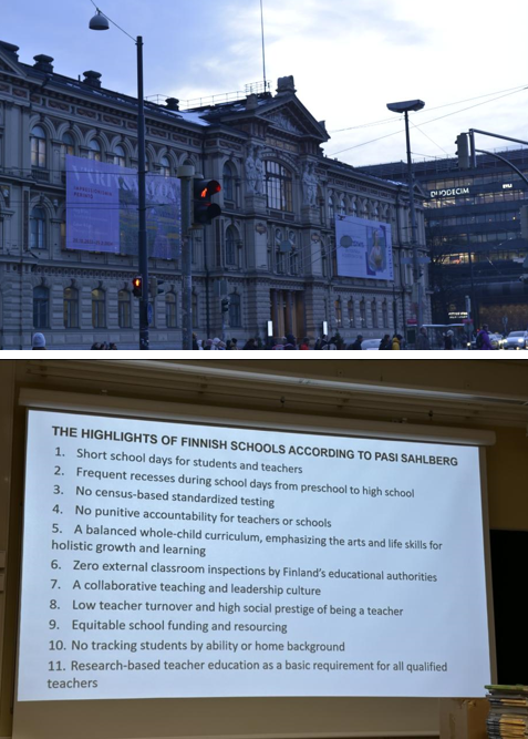 今天总结起来就是震惊+震惊的一天,听到了震惊的观点,感受到了震惊的教育模式。“We are producing people, not English speaker”,这算是今天印象最深刻的一句,来自一位当地中学校里的英语老师。 今天首先邀请了一位赫大的一个中国人老师(这个老师五十多岁了,真的是自己一步一个脚印在芬兰从零开始,现在定居在芬兰)给我们讲芬兰提出的“21世纪能力”的概念,包括很多我们耳熟能详的“领导力”、“沟通能力”、“自我管理能力等等”,其实在中国我们也讲所谓的“核心素养”或者是“德智体美劳全面发展”,但是这些东西总是空洞的、应付的,在应试教育背景下除了能提高分数的东西,其他的一切都应该被扼杀。 但是在这里,人们真的在践行这些事情,除了大家可以想象得到的芬兰学校会全面培养孩子,最让我想象不到的她提及的21世纪能力中的一项“学生的工作和创业能力”。她说,在芬兰上学的每一个小孩在初中时都会被要求在一个学期内至少有两周在外工作的时间(比如咖啡店等等),学生们没有薪水,只是体验工作的感受。除此之外,在高中时学生会被鼓励自己去开公司。没错!就是开公司!并且这并不是一件儿戏,而是真正地从银行创建账户开始,公司会有自己的股份,之后一切流程都按照标准来,他们不为赚钱,只是为了培养学生的创业能力。她说她的女儿先后开了两个公司,第二个公司与四五个同学一起开了一家芬兰蓝莓汽水公司,并且这个公司非常成功,在国内、欧洲都获得了很多奖项,还会在欧洲巡回做千人演讲。我不禁回顾自己的初高中生活,我和我周围的人都只能盯着自己眼前的书本,应试教育的阴影已经完全笼罩着我们,让我们谈不了理想,看不见其他可能性。 然后我们又切身地来到一家芬兰的中学校(这跟国内好像不太一样,6-19岁的学生都可以在里面读书),接待我们的是一位英语老师,他的每一句话每一个观点都说到大家心坎里去,有好几个瞬间我都快要因为他的话而热泪眼眶了。 首先,在芬兰教育是完全免费的,小学初中高中大学全是免费,他说“If you can get a master degree free, why not ?”,我想这也就是为什么芬兰人均教育水平都很高的原因吧,教育资源在这里不是稀缺品,不是奢侈品,只要你想学习,那么学习的大门就会为你打开,而免费的学习也让这里的人们养成了终身学习的习惯。 其次,在芬兰,所有老师都是自由的,没有人会来管你这堂课有没有按照大纲走,校长不会考察你,整个教育系统也没有老师评价体系这一说法(学校也是,没有标准的评价体系,他们不会相互judge),所以,老师可以按照任何自己想要教学的方式来上课,如果一堂课有不同小组,每一个组内的教学都不会完全一样,可以说是真正意义上的因材施教。这里的老师不用写report,不用花心思应付家长,所以他们可以完全专注于把自己的课讲好,这么听起来真的是win-win的逻辑。 他说,这里的人们相信彼此,对于教育也是如此,老师相信学生,反之亦然,家长也相信学校和老师,所以这里的孩子一般都是就近上学,不会有人为了去某个学校而长途跋涉,因为他们真的“相信”。“You know, we just believe.” 作为一名英语老师,他讲到,像英语这种学科,它并不是一大块knowledge放在那里,老师每次从中取一块讲解然后循环往复,而是一种tool,他需要做的是让学生会用这些工具,学会交流,就像最开始提到的那句话“We are producing people, not English speaker”,如何成长为一个“完整的人”是最重要的。 最后,我们实际走进了一堂课去旁听,看到那些理论上的教学模式真正应用于实际时我还是觉得五味杂陈,一方面很羡慕这一个班里14个孩子可以得到良好的教育,一方面又不免为中国大部分“小镇做题家”感到一点点可悲,我不知道我们前十八年的努力可以换算成多少“人的成长”,这或许是个无解的问题。 有一个同行的学生问他为什么当老师,他回答说他最开始其实并不是老师,只是工作了几年之后想要换个环境所以选择了教师,他很感激自己的这个决定,因为在看见自己学生进步时他觉得那简直是世界上最棒的事情。包括那个中国人老师一开始也不是从事教育行业,四十几岁才决定读教育学的第二个phd。好像在这里的人们随时可以重启自己的人生,在任何时间点尝试自己想尝试的任何事业,但我们中国人那“关键的一生”框定了我们的道路,我们没有重新开始的勇气,社会也没有包容重新开始的人的空间。于是我们开始慢慢变得麻木。 看见听见这些之后我还是不免在内心作了对比,我知道这不能简单归结为“芬兰的教育好,中国的不行”,因为有太多额外因素掺杂着,比如国情的不同,供求关系的不同等等。教育理念在这个互联网时代实际上早就达成了互通,应该也不乏有中国老师来到芬兰,也像我一样看到了这些,或许我们都想改变些什么,但是现实却是无能为力。我不知道赤手空拳如何能积少成多,我不知道颠覆性的改变有没有可能发生,我不知道免费的教育如何才能在中国实现…发达国家和发展中国家之间还是存在云泥之别,教育只能是在适合国情的基础下改善,而不可能完全照搬,认识到这一点我有一点泄气的感觉,虽然我以后大概率也不会从事教育行业,但是我依旧觉得教育事业在中国还任重道远。