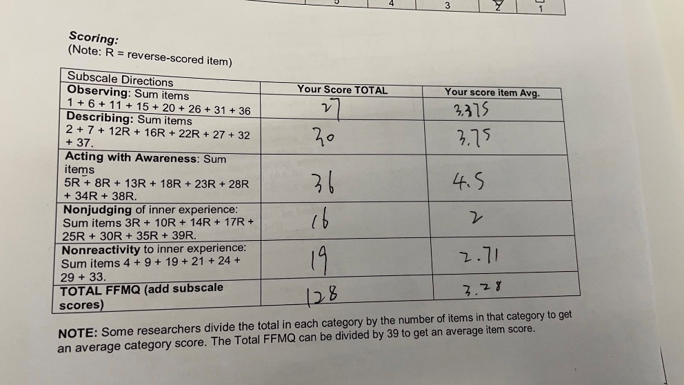 图片 1 正念量表测验 这一周的学习让我对心理健康问题有了更深刻的认识,这是之前在北师大学习中从未接触过的知识内容和学习方式。变态心理学在大三上开设,心理咨询在大三下开设。在北师大的本科教育中,很少有机会充分了解临床心理学的知识,而在KCL的课程中,不仅有理论知识的学习,还有基于病例的分析与研讨,兼具科学性和人文关怀,让我充分感受到了临床心理学的魅力,也希望北师大能多开设类似的课程,在专业基础课之外提供更灵活和趣味的选择。