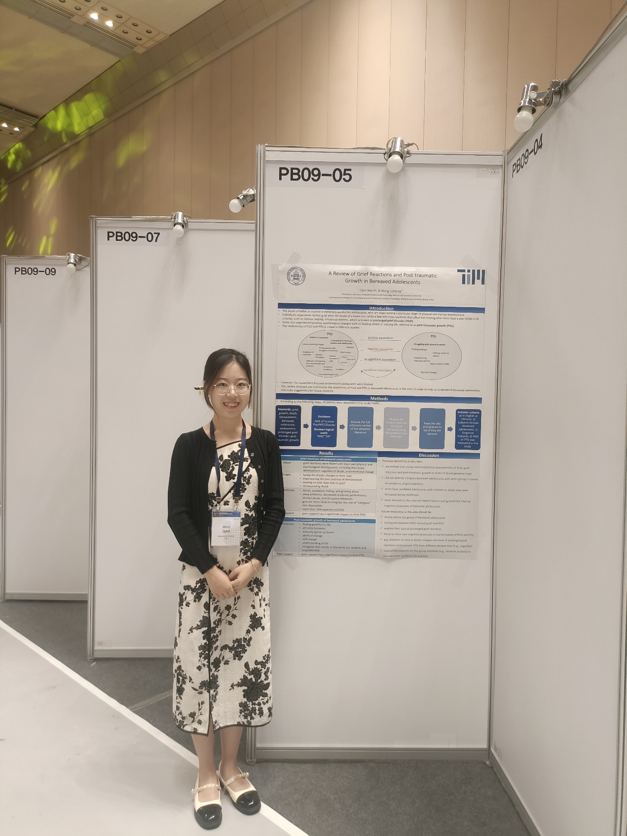 我的参会内容是海报展示,海报的题目是“A Review of grief reactions and posttraumatic growth in bereaved adolescents”,内容是综述了延长哀伤障碍和创伤后成长的定义、现有研究的关系、丧亲青少年的相关研究现状、丧亲青少年延长哀伤症状和创伤后成长表现的特点、以及现有研究的不足和未来研究的展望,制作海报的过程中我也注重制做图表,更加清晰地展示其中的内容。在海报展示期间,或许是因为“丧亲”“哀伤”话题的沉重,加上又是“青少年”这一群体,痛上加痛的感受吸引了大家的注意,有很多国外研究者对我的海报话题感兴趣,希望我向他们介绍(由于当时稍有匆忙,忘记请周围人帮忙将讨论的过程拍照了)。在讨论过程中,几位土耳其的在读硕士向我们表达了肯定和尊敬,表示关注丧亲者的心理健康真的很重要,但是在真实的研究过程中一定很难;两位日本和韩国在读博士、一位韩国教师都对延长哀伤症状和创伤后成长的关系感兴趣,我向他们详细地讲述现有研究的结果不一致:有的研究发现两者是正相关、负相关、没有显著关系,也有研究发现是曲线关系,这可能和丧亲事件的特点以及人群有关。在我已经发表的一篇文章中发现疫情期间近期丧亲的成年人延长哀伤症状和创伤后成长之间是曲线的关系,也就是中等水平的延长哀伤症状与高水平的成长有关,即我们适度的哀伤是具有适应性意义的。几位研究者也对这一研究结果表示肯定,并表达了还会去阅读我已发表论文内容的兴趣。还有一位马来西亚的研究者,向我提问了许多关于哀伤领域的理论和问题,如如何帮助丧亲者适应等,也肯定了我做这个方向的意义感,讨论结束后我们还互相添加好友。 此外,我在海报区发现了一位对韩国丧亲青少年哀伤适应问卷的编制与检验的研究,她告诉我在实际过程中发现同伴对于丧亲青少年的支持作用其实不像理论中提到的那么有效,因为丧亲青少年会回避这一话题,不向同伴提起。在第二天的海报区,我还看到了一项使用复杂哀伤疗法干预一位丧失女儿的母亲的个案研究,我请教这位研究者在整个过程中最有效的步骤是什么,她告诉我是哀伤暴露。丧亲者自己压抑和隐藏哀伤太久,对于身心适应十分不利,尽管哀伤暴露的过程有些痛苦,但是在暴露结束后效果十分显著,丧亲者的延长哀伤水平显著下降。这也促使了我对丧亲者哀伤适应的思考,或许之后我可以进一步去探究这其中的机制。另外,我在海报区也发现了很多有趣的研究,我也都向研究者进行了提问并交流自己的看法,这个过程真的很有趣,我能感受到每一位研究者的热忱,在向其他人介绍的时候像在介绍自己的孩子一样。同时,我也发现海报区很多研究都在做电子化干预,如CBT小程序,我猜测这种现象可能是疫情、也可能是科技的发展给临床与咨询心理学带来的影响。尽管国内也有类似的研究,但是还比较有限,或许这是今后本领域的必经之路。