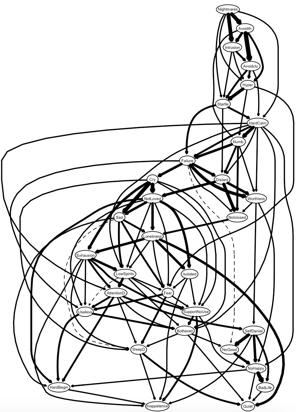 图3 CPTSD与抑郁症状共存的有向无环图网络 上述两项成果的第一作者为实验室毕业硕士生林文舟(现香港中文大学任职),毕业博士生刘艾祎(现中科院心理所博士后、助理研究员)和在读博士生刘明宵为共同作者,伍新春教授为通讯作者。