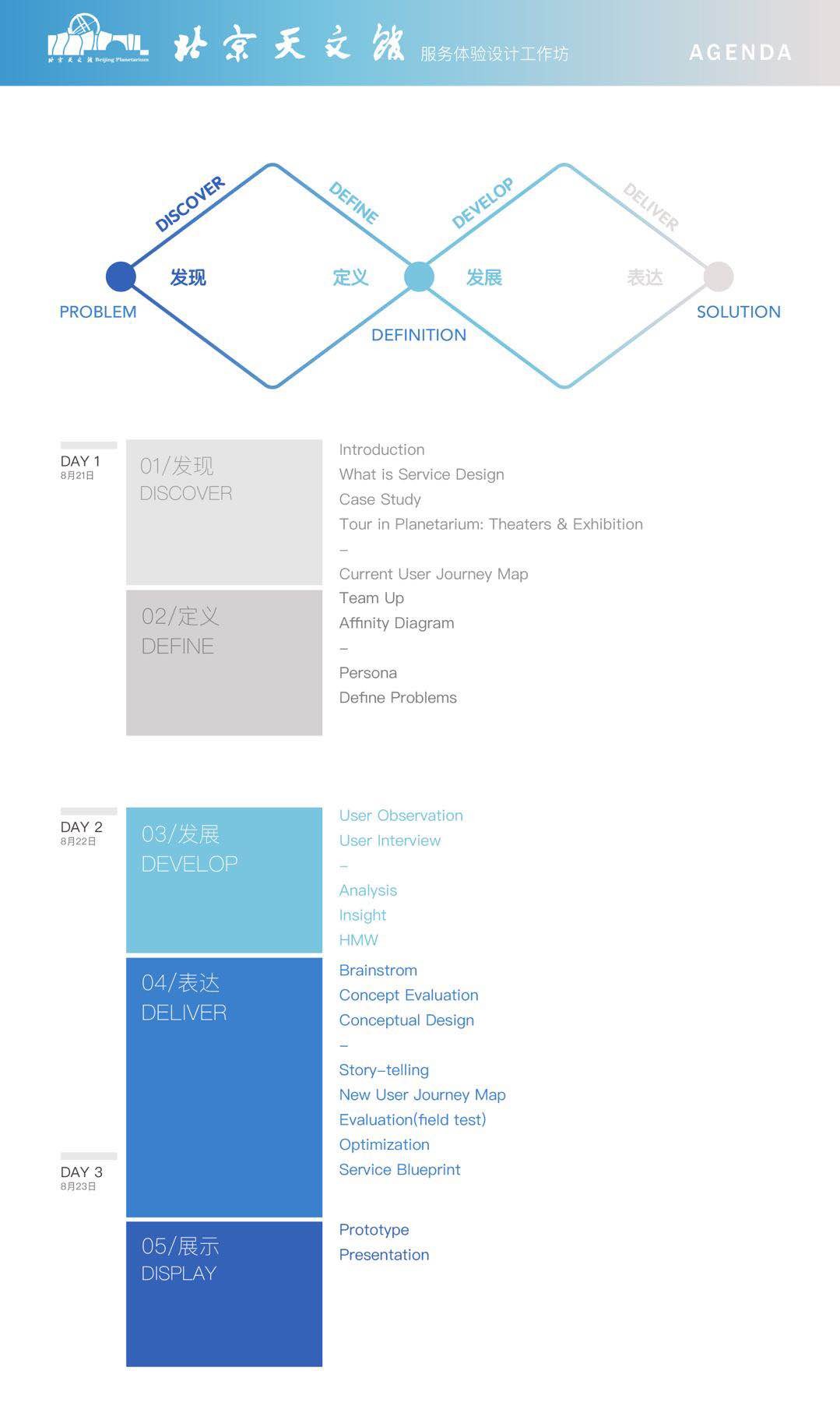 本次工作坊由欧洲杯 联合北京天文馆共同举办。我国的服务设计领域尚处萌芽阶段,随着人们的消费预期的不断提高,现有的服务设施与服务系统不再满足消费者的需求。因此,传统行业需要对自身所传递的服务予以特别的关注,服务体验设计也变得尤为重要。2018年8月21日至8月23日,Ellen de Vos博士和辛欣老师将给我们带来“北京天文馆服务体验设计工作坊”,工作坊以“天文馆的旅行”为起点,将基于天文馆的真实情境,运用一系列服务设计方法与策略,引导学员们进行服务体验的创新设计。从痛点挖掘、概念形成、再到方案设计,帮助学员们建立“全流程”的服务设计思维。 天文馆服务体验设计工作坊将从发现、定义、发展、表达、展示五大环节展开,并通过现场互动、任务实战等方式让参加学员深入学习包括Persona、HMW、User Journey Map、Story Telling等“新技能”。 图5 北京天文馆服务体验设计工作坊日程安排