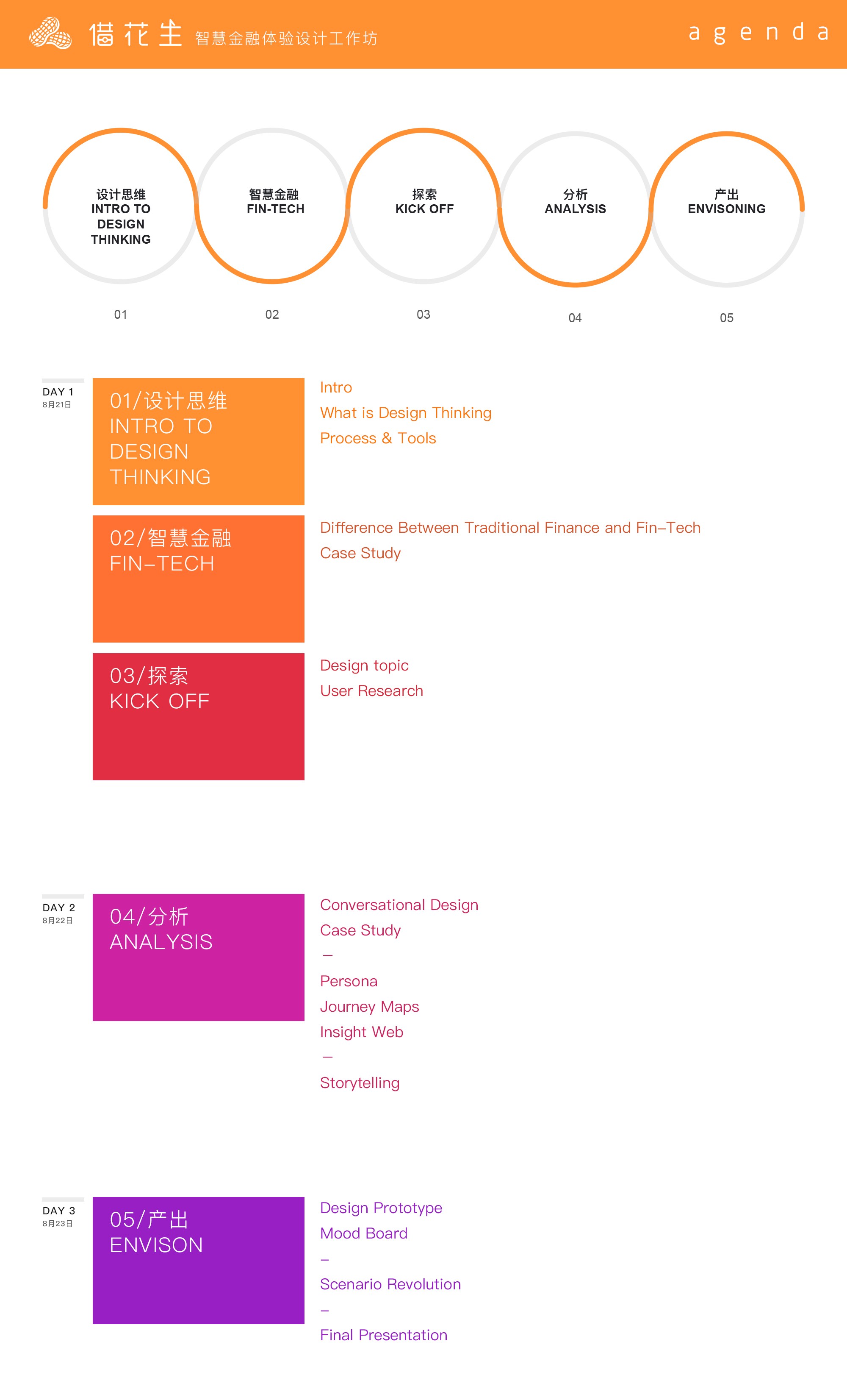 聚焦互联网金融领域中“借”、“花”、“生”的完整行为链路体验策略,三天的工作坊将通过设计思维引入、智慧金融细分领域探究、设计主题的展开、研究分析和设计产出五大环节展开,并通过现场互动、任务实战等方式让参加学员深入学习包括Paradox analysis、Ethnographic research、Journey maps等“新技能”。 图3 “借花生”智慧金融体验设计工作坊日程安排