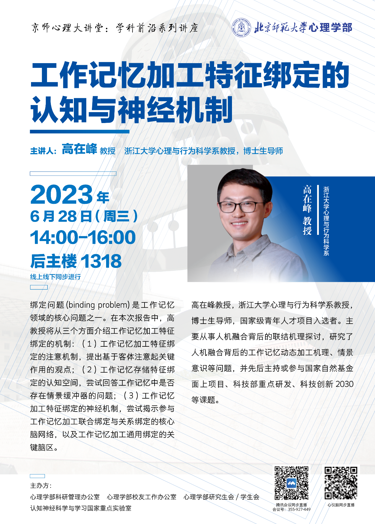 讲座预告:工作记忆加工特征绑定的认知与神经机制