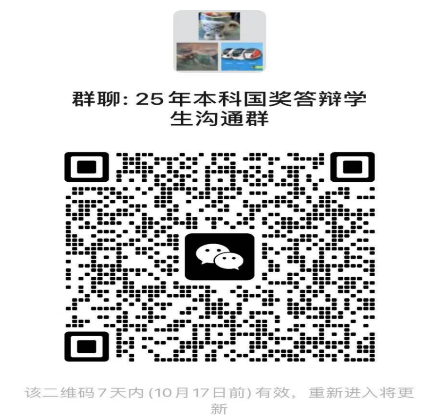 四、注意事项 1、每位同学的自我陈述时间为3分钟(需准备PPT),评委提问5分钟。 2、请所有参加面试的同学提前15分钟找答辩秘书签到,可从开场开始进行旁听; 3、面试当天请自行准备10份个人简历,并在签到时交给答辩秘书; 4、请将面试PPT最晚于10月11日(周六)上午8点前发送至[email protected]; 5、请各位同学准时参加面试,如错过面试时间,则视为自动放弃申请资格,之后不再补面; 6、请各位候选同学扫码进沟通群; 7、诚邀欧洲杯 各年级在读本科生前来观摩和学习,相信每位国奖候选人都有各自不同的闪光点和长处,也希望欧洲杯更多的同学们能从同学们身上找到适合自己发展的更多可能性。