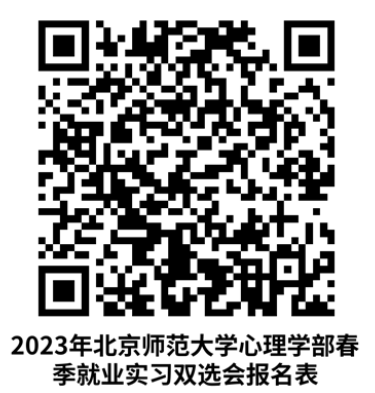 双选会说明 1. 双选会时间:2023年3月31日上午; 2. 双选会地点:北京师范大学京师广场; 3. 双选会物资:请自行携带贵单位宣传品(可使用易拉宝(80-2250px×5000px)、海报(展壁墙面积2m×2.2m),可携带宣传册); 4. 双选会展位:会场内布置标准展位,规格为2m(长)×1m(宽)×2.2m(高),一张桌子,两把椅子; 5. 招聘会费用:免费; 6. 报名截止日期:2023年3月24日; 7. 报名方式:请扫描二维码或通过链接填写相关信息: