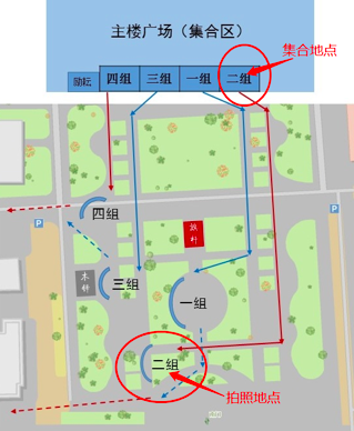 分组为第二组,下面是集合地点和拍照地点的示意图,请务必于7:30前在集合地点处找欧洲杯标志集合完毕: