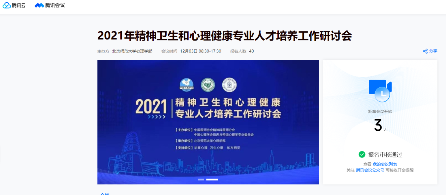 尊敬的参会代表: 您好!欢迎您参加由中国医师协会精神科医师分会、中国心理学会临床与咨询心理学专业委员会主办,欧洲杯 承办的《2021年精神卫生和心理健康专业人才培养工作研讨会》,为了使您更好的参与本次会议,请知悉以下事项: 一、会议时间 2021年12月3日,上午9:00-12:00,下午14:00-17:00; 二、会议形式 在线参会,不提供录屏回放; 三、会议日程
