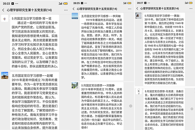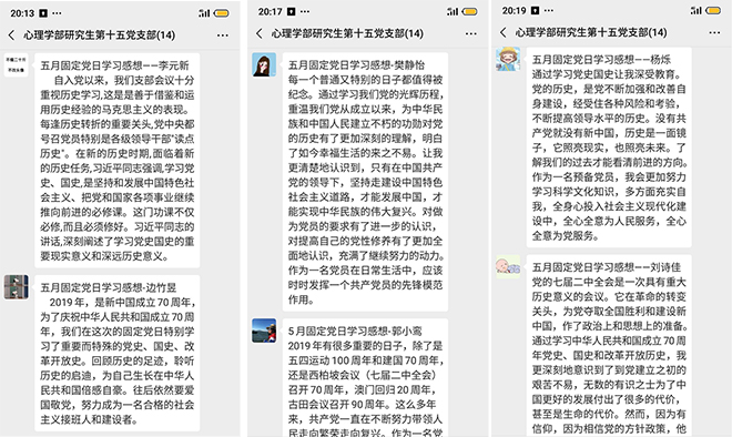 2019年5月22日,研究生第十五党支部于北京师范大学心理健康服务中心举办了“庆祝中华人民共和国成立70周年党史、国史、改革开放史等学习”固定党日理论学习活动。本次学习活动的学习材料有《2019年,你不可不知的党史国史纪念日-党史频道》、《习近平:在纪念五四运动100周年大会上的讲话-新华网》、《直播回看:习近平出席纪念五四运动100周年大会并发表重要讲话》。 本次固定党日的学习中,党员们认真地学习党史、国史等知识,并将自己的学习感想以文字的方式分享至党群中,如图所示: