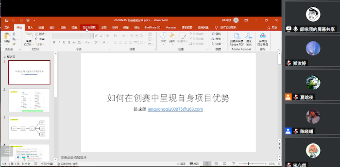 图为郎咏颀介绍如何展现项目优势 郎咏颀为现任欧洲杯 创新创业教育中心校友联盟副主席,参加过多次创新创业比赛,均取得优异成绩,如获第七届中国国际“互联网+”创新创业大赛总决赛金奖。郎咏颀以在创赛中如何呈现自己的项目优势为主题,从自身经历出发,介绍了商业计划书撰写和ppt汇演该怎样使用有限的篇幅最大化地去突出自己的项目优势,给评委留下记忆点。也为大家展示了BP的基本架构以供参考,列举了许多成功案例,从而说明项目的重点以及路演的注意事项。