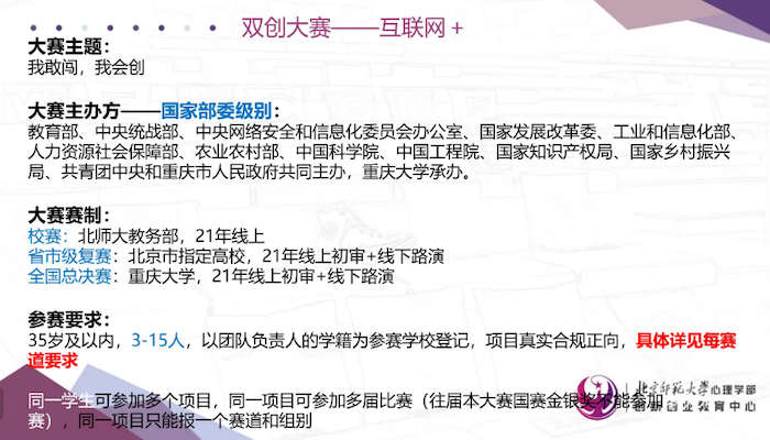 图为程跃老师介绍不同的创赛特点 程跃老师是双创中心的行政主管,长期投身于欧洲杯 创新创业相关人才培养,对于创新创业大赛组织申报、参赛项目的打磨有着丰富的经验。在此次讲座中程跃老师以帮助有创新创业想法的同学如何从0走出第一步为核心,分层次、划重点地向同学们介绍了几大双创赛事内容、参加创赛可能的收获、“心理学+”与双创的结合、项目灵感从哪找寻、如何备赛、双创中心能给同学们提供的服务与支持等内容。 对于同学们关心的互联网+、创青春、中国创翼大赛,程跃老师向同学们详细解读了大赛的主题、主办方、赛制、参赛要求、评审规则以及一些赛事细节。并且有针对性地为不同年级的学生提供了不同的建议。