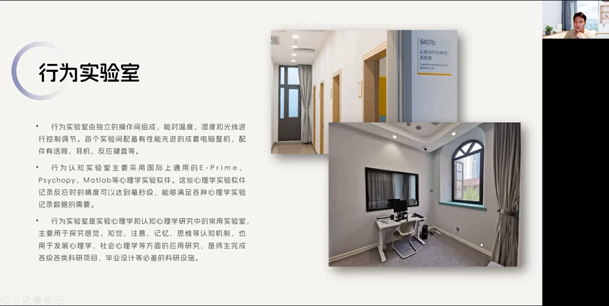 珠海校区心理学科实验平台建设负责人胡路明老师介绍了珠海校区的实验室配置、各种线下线上资源,以及实验室的使用条例。
