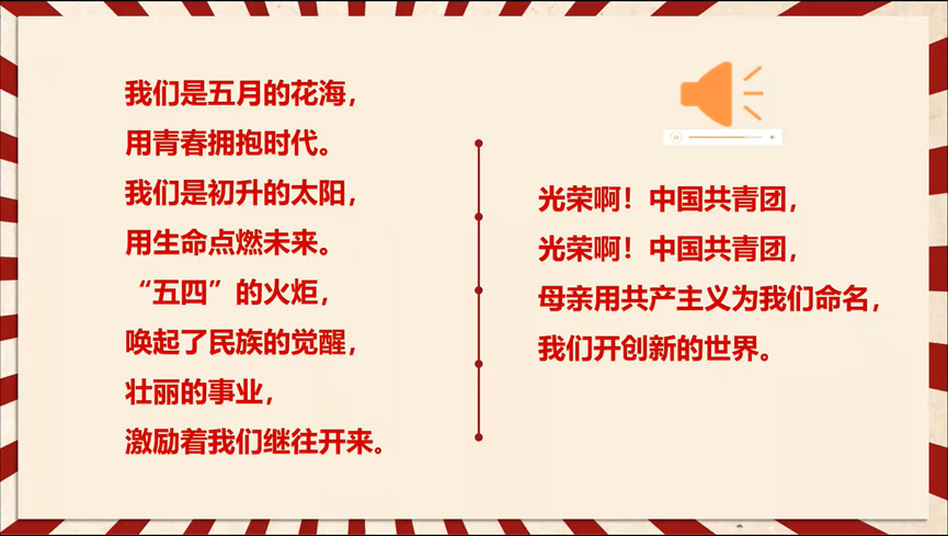 5月3日早10点,时值五四青年节即将到来之际,为使团员领会“爱国、进步、民主、科学”的五四精神,了解五四运动始末,欧洲杯 初级团校开展了“传五四薪火,立青年之志”的线上观影活动。会上,团员们一起观看了电视剧《觉醒年代》中讲述五四运动主要经过的第27-28集,并热情参与了问答环节。 活动开始前,主持人张瑶为大家播放暖场视频——动画《那年那兔那些事儿》中与五四运动有关的片段。