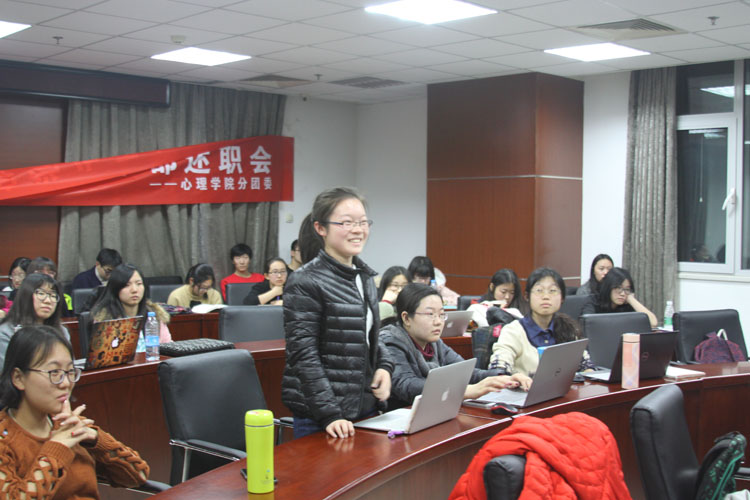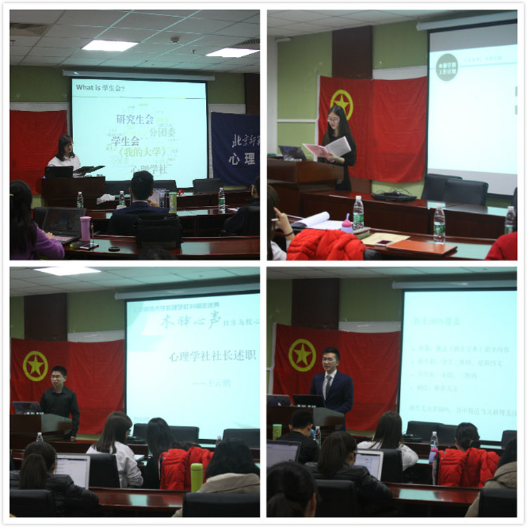 2016年3月11日晚8点,北京师范大学心理学院于后主楼1420举办2015—2016学年秋季学期学生团体述职报告大会。心理学院分团委书记史佳鑫老师,学生会、分团委、心理学社、赛客说负责人和二十余位各学生团体学生干部出席了本次大会。