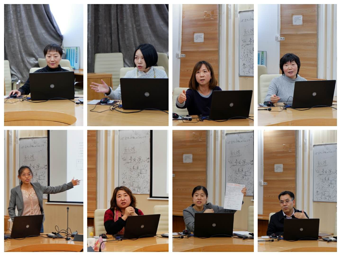 首先,姚梅林教授给与会师生分享了重庆会议内容。 “会上各校教师反馈了在线培训及面对面培训中存在的问题。”她表示,具体而言,线上培训中各模块学习时长、案例、视频数量及学习资料的翻译等问题受到关注,而面对面培训中培训材料的适用性、培训内容的系统性、教师和受训者间互动的丰富性、语言沟通的流畅性及培训时间的充足性等问题成为讨论的重点。 紧接着,种子教师围绕能力本位教育(CBE)理念、基于教师胜任力框架的活动教学(CBA)在本学期职前教师教学实践中的应用情况进行了汇报。“在课程设计中增加了基于教师胜任力的课堂活动设计、小组学习及评估等环节,有效提升了学生的课堂体验。”毕红霞老师表示。郭玮老师指出,将测验应用于教学目标的制定,并依据教学目标设计特定的教学活动,三者间的良性循环有效解决了如何制定教学目标及如何设计教学活动的问题。曹慧老师表示,她将“以学生为中心”教学理念运用于短期课程,任务导向的教学方式充分调动了学生的学习主动性,大大增强了教学效果。欧璐莎老师强调了测量工具的重要意义:“测量工具通过确定具体的测量指标和评分等级,降低了评价的主观性,为教学实践的改善提供了方向。”“基于CBE思想的课程在学生的认可度评估中获得了99.2的高分”,张允老师欣喜地与我们分享了她的实践成果。理论的实践不可能一帆风顺,韩锋老师在肯定培训效果的同时,就小组学习在数学教学中的应用表达了自己的疑惑:“小组组长的个人学习能力及负责水平会影响小组的学习效果”。 图2-3 TKcom职前教师培训研讨会会议现场