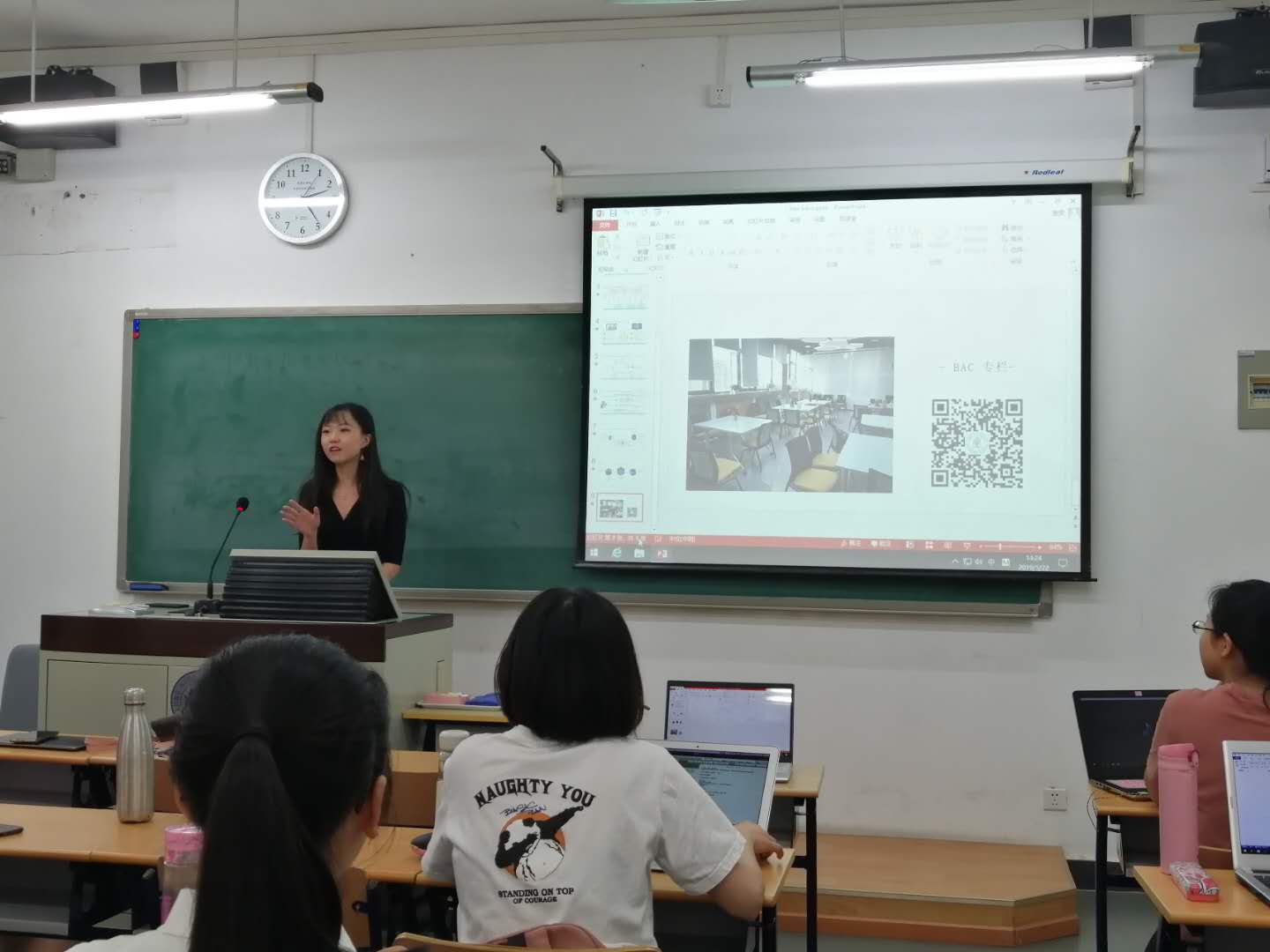 王海燕师姐向同学们分享了她在BAC领域的切身体验——拥有的技能越多越有竞争力。师姐介绍了BAC研究性的就业趋势、心理学和商业的差异和结合、定性研究和定量研究的优劣等内容。师姐的分享非常具有专业性和现实性,同学们有很大收获。