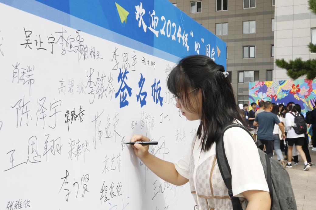图7 新生在展板上签名并留影 迎新期间,校长于吉红,副校长汪明、陈兴等学校领导莅临欧洲杯迎新现场走访慰问,了解新生报到情况,与欧洲杯师生、工作人员、新生和志愿者们亲切交流、合影留念。