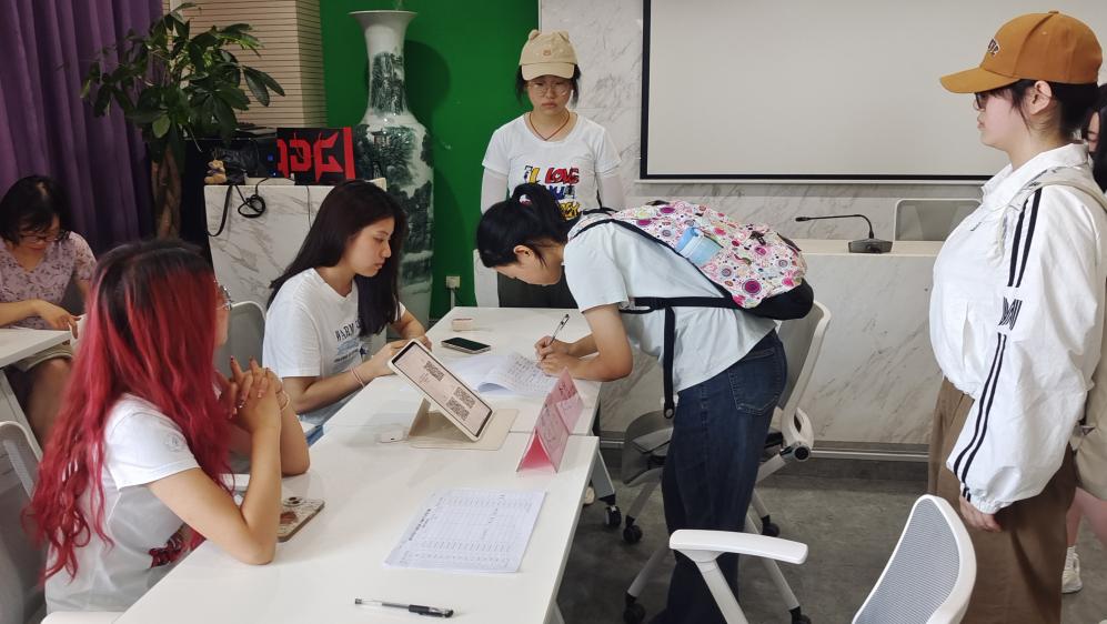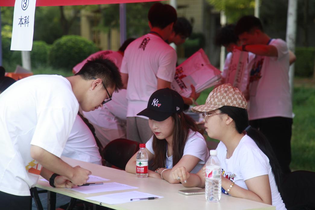 图5 工作人员为新生办理手续(后主楼1318) 新生在迎新站依次完成录取通知书盖章、电子注册、领取迎新物资后,由工作人员引导在新生签名板上签名并拍照合影,接受简短采访,留下踏入校园的第一次青春纪念。随后,新生在老生志愿者的一对一引领下,前往后主楼迎新教室办理户档等手续。专硕同学则在后主楼1420完成所有报到,并领取定制迎新礼包。开学第一天,新生们都收获了学校、欧洲杯以及师兄师姐们满满的关心和关爱。