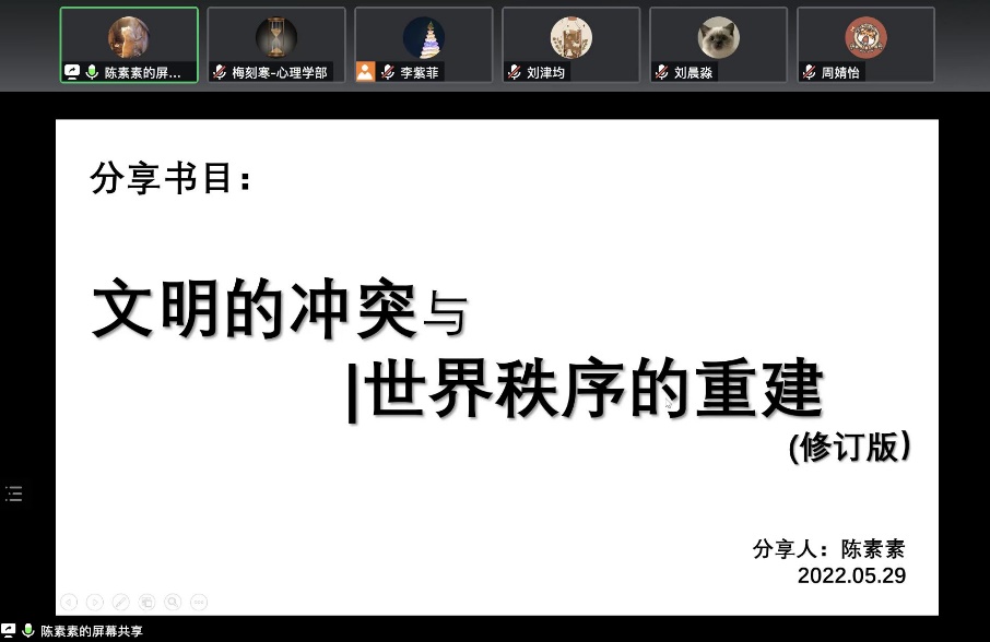 陈素素同志对《文明的冲突与世界秩序的重建》一书的分享中,结合自己对书中内容的思考和写作背景,对一个多文明的世界、变动中各文明力量的对比、正在形成的文明秩序、文明的冲突和文明的未来进行了介绍。对书中所谈到的,文明的概念、普世文明的问题、权力和文化之间的关系、文明之间均势的转移、非西方社会中的文化本土化、文明的政治结构等多个核心问题进行了讲解。