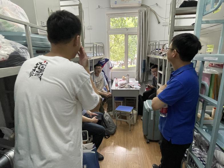 新生班主任李海虹老师、王乾东老师、刘然老师带领学长导师田汉墉、董笑言、刘慕义、张静雯、杨若彤、童心海前往学生宿舍,了解新生的住宿和生活情况,与同学们倾心交谈,传递来自班主任与学长的暖心关怀。
