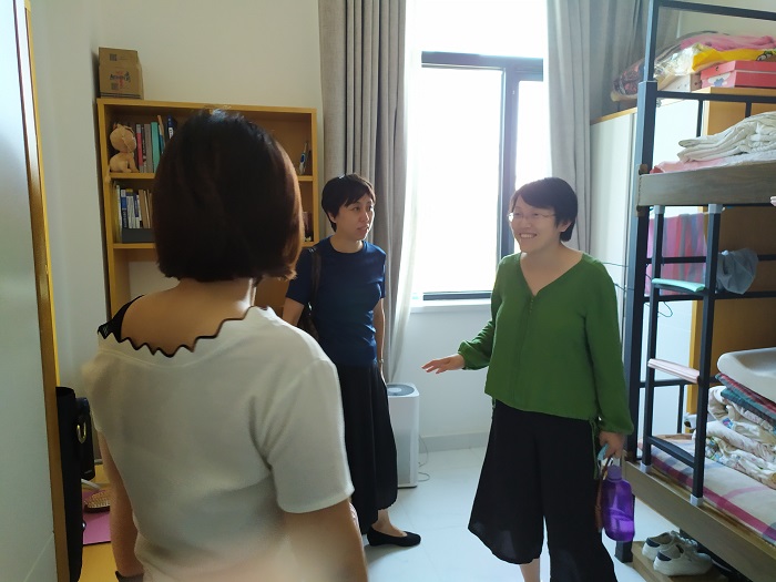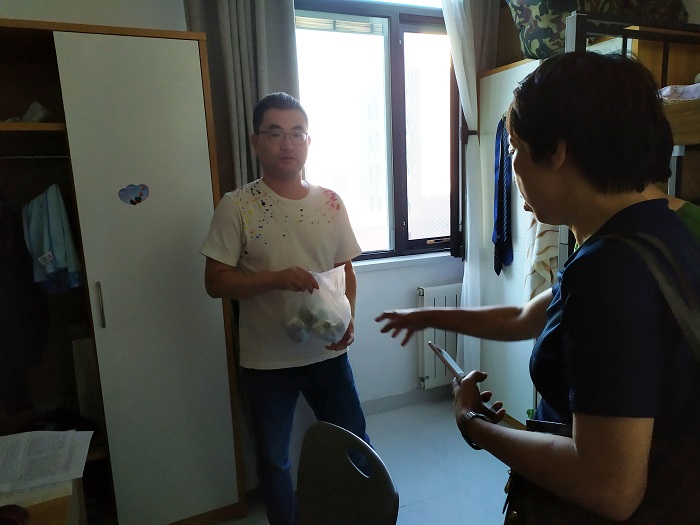 到达昌平校园后,王瑞敏老师、邢爱玲老师和刘佳辉老师走访了男生宿舍和女生宿舍,在与同学们的交谈中,老师们从入学适应、学业发展、科研进展到班车通勤、宿舍布置、生活安全等多方面了解学生们的近况,深切地表达了对同学们的关心和问候,同时鼓励大家多组织班级团建活动,积极建立情感联结。