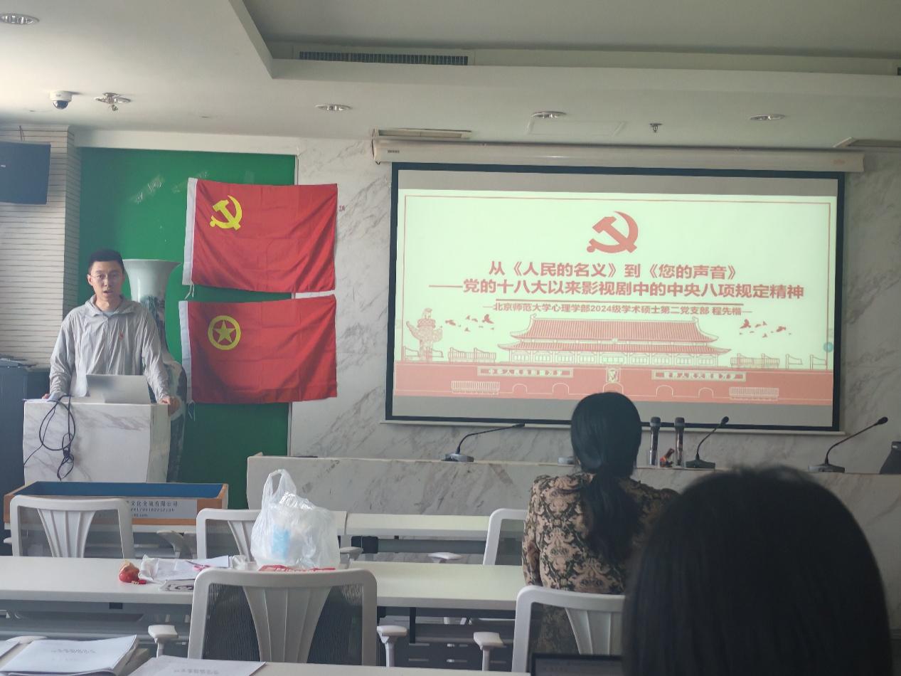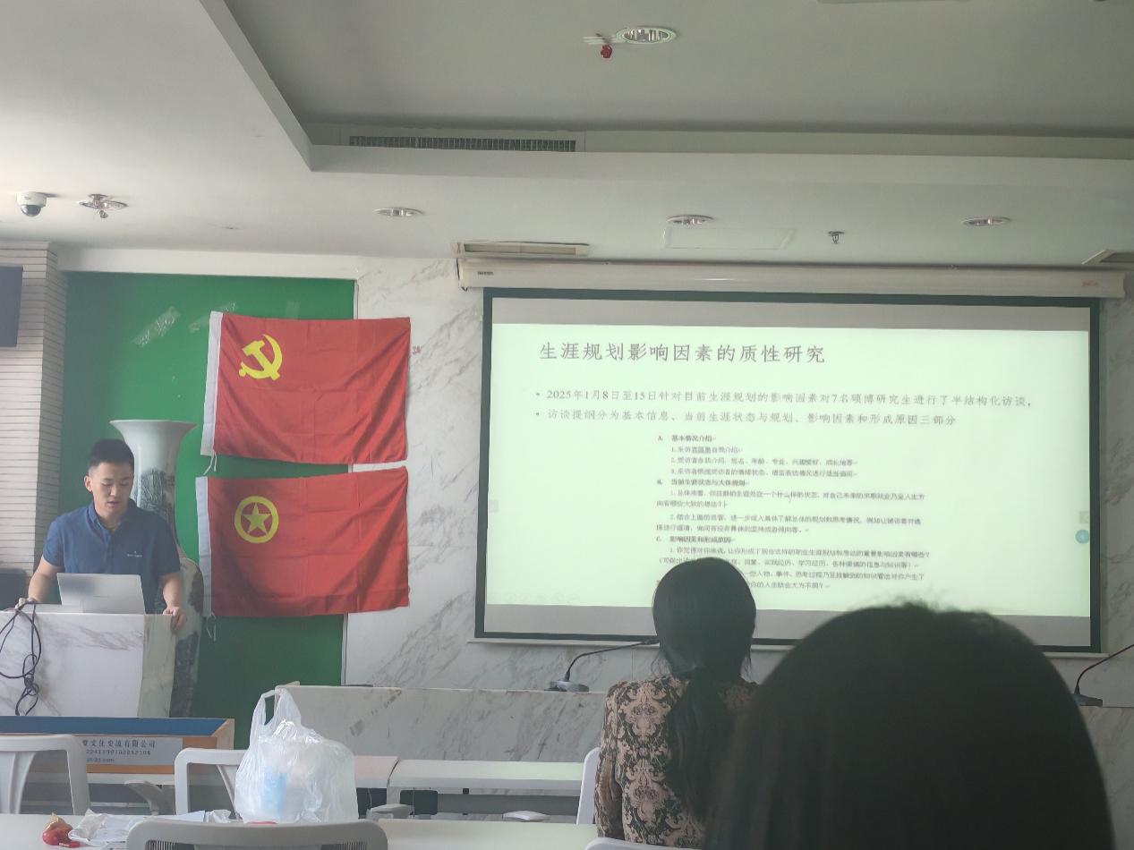 程先楷同志从2017年热播电视剧《人民的名义》谈起,分析了剧本背后体现的“打虎拍蝇”反腐败工作。与此相似的是2023年播出的以扫黑除恶专项斗争为主线的电视剧《狂飙》。今年年初,在院线上映的《您的声音》系统展现了我们党和政府的基层工作者解决群众关心问题的全过程。程先楷同志解析了影视化表达中蕴藏的中央八项规定精神的多方面内容,重点强调了党的自我革命的重大意义,以及做好群众工作的必要性。 随后,预备党员高星灿同志作了题为《关于北师大研究生生涯规划影响因素的质性研究》的专业分享。通过半结构化访谈和主题分析,这项研究从背景性因素、社会网络与系统参照、自身探索收获和认知重构四个大方面归纳了影响临毕业研究生生涯规划的因素。