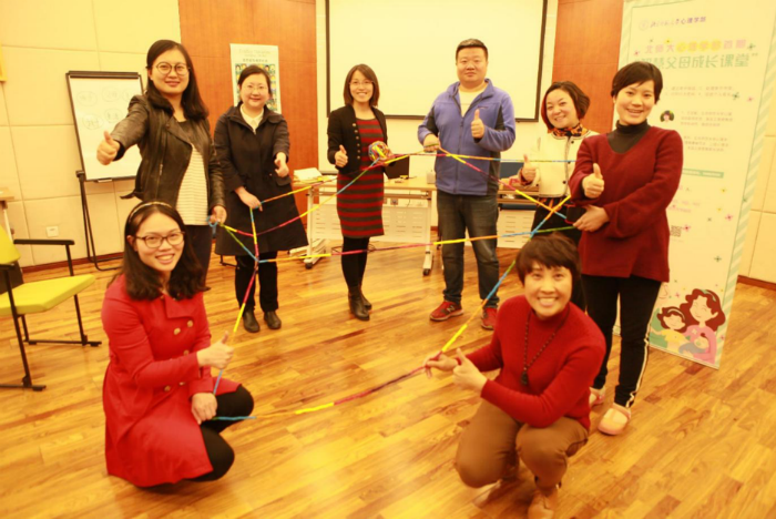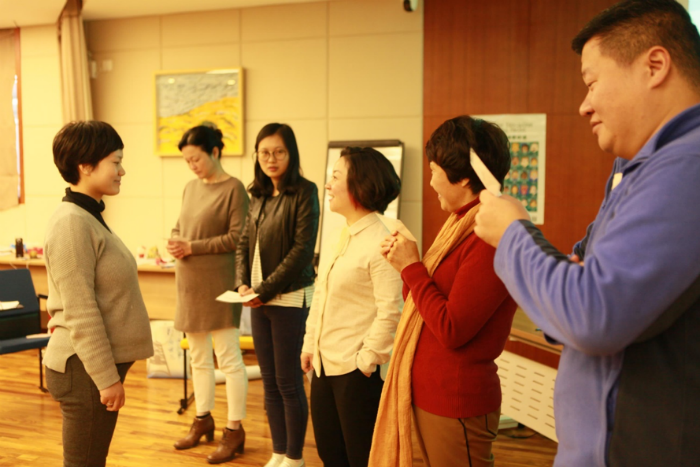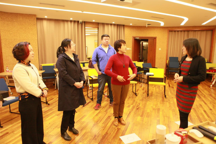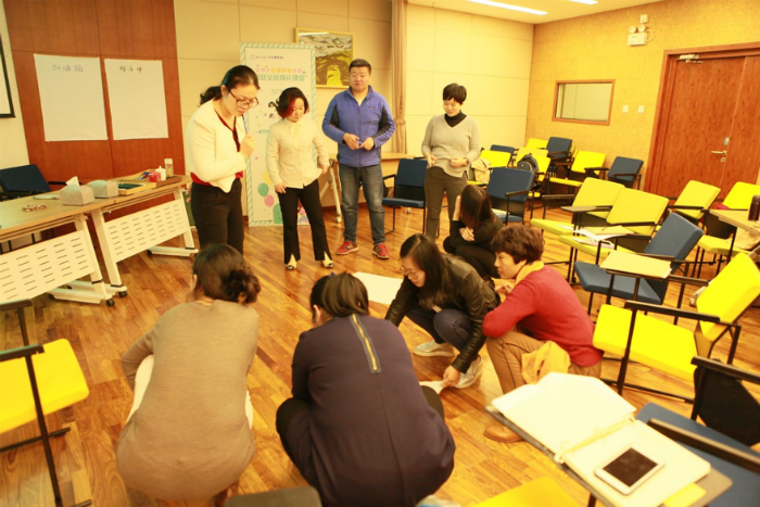培训由身体活动的热身拉开帷幕,在各位家长开始关注身体的感觉,并将四肢活动开来融入课程时,要求每位家长制作一个小的沙盘作品。从沙具架子上找代表自己和孩子的沙具,然后在带有圆形边界的白纸上摆出一个简单的沙盘,代表自己与孩子互动的场景。制作完成后,让每位家长分享所制作的沙盘的故事,以此了解每位家长与孩子的互动模式。 随后,进入课程的主体部分,首先强调体会“感受”的重要性,要求所有学员在本期课程中时刻关注自己的感受,练习觉察自己的感受并将其说出来。并引导各位学员在生活中,觉察孩子的感受,理解其感受背后的真正意愿是什么,从而走进孩子的内心。抛出生活中孩子可能出现的一些典型的不恰当行为,引导家长思考孩子行为背后的感受与意图。由一位学员扮演孩子,其它学员作为其家长执行平时生活中常见的处理孩子行为的方式,通过这个活动让各位学员察觉我们的处理方式会给孩子带来怎样的感受,以及当我们使用这种方式时自己内心的感受。随后引出一些合理可行的解决方法,如“接纳、共情、赋权、 赞赏、启发等”。那么,当孩子做得好的时候家长们应该怎么做呢?由一个微缩型情境展示上演孩子生活中经常会面临的三种情况:被鼓励、被表扬与被忽视。借此让所有家长理解面对三种不同情况时孩子的心里感受,且长此以往会给孩子人生带来的怎样的改变,从而让家长们自己领悟,并得出平时因更多地采用何种方式在孩子做得好时进行互动。