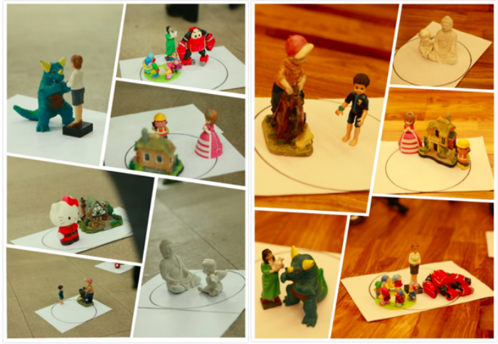 在后续的课程中,黄利老师展示了很多平时亲子互动过程中孩子出现的问题,通过角色扮演的形式让家长们通过某种给定的解决方法自行应用,并谈论采用这种方法所能达到的效果及他们的感受。通过“墙、棉花、树”的活动,向各位学员抛出 “和善而坚定”的处理方式,让我们在面对孩子时,如同一棵树,对待孩子时有自己的原则与底线,不溺爱、不骄纵、不惩罚,能坚守自己、尊重自己,但也能有弹性和灵活的那一面,懂得尊重孩子的感受。黄利老师为各位学员展示了很多亲子互动交往的技巧与方法,以及培养良好亲子关系的道与术。在第一部分接近尾声时,允许各位学员调整他们一开始制作的沙盘作品,调整后各位家长对为什么进行调整以及调整后的作品的意义进行分享。大部分学员对调整后的作品描述为,“在之前的作品中,我们是相对相向的,有问题时是对立的,而现在我和孩子是肩并肩靠在一起的,和孩子融合在一起,跟问题对立”。