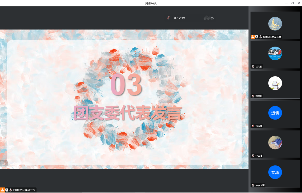 接下来团支书段雨欣同学汇报了团支部上一学年整体工作和“学习二十大、永远跟党走、奋进新征程”主题教育实践活动情况,特别是学习党的二十大精神情况和组织生活会准备情况,并结合团支部工作和个人实际交流体会认识。我支部将继续高举团旗跟党走,在全面建设社会主义现代化国家的新征程上贡献青春力量!