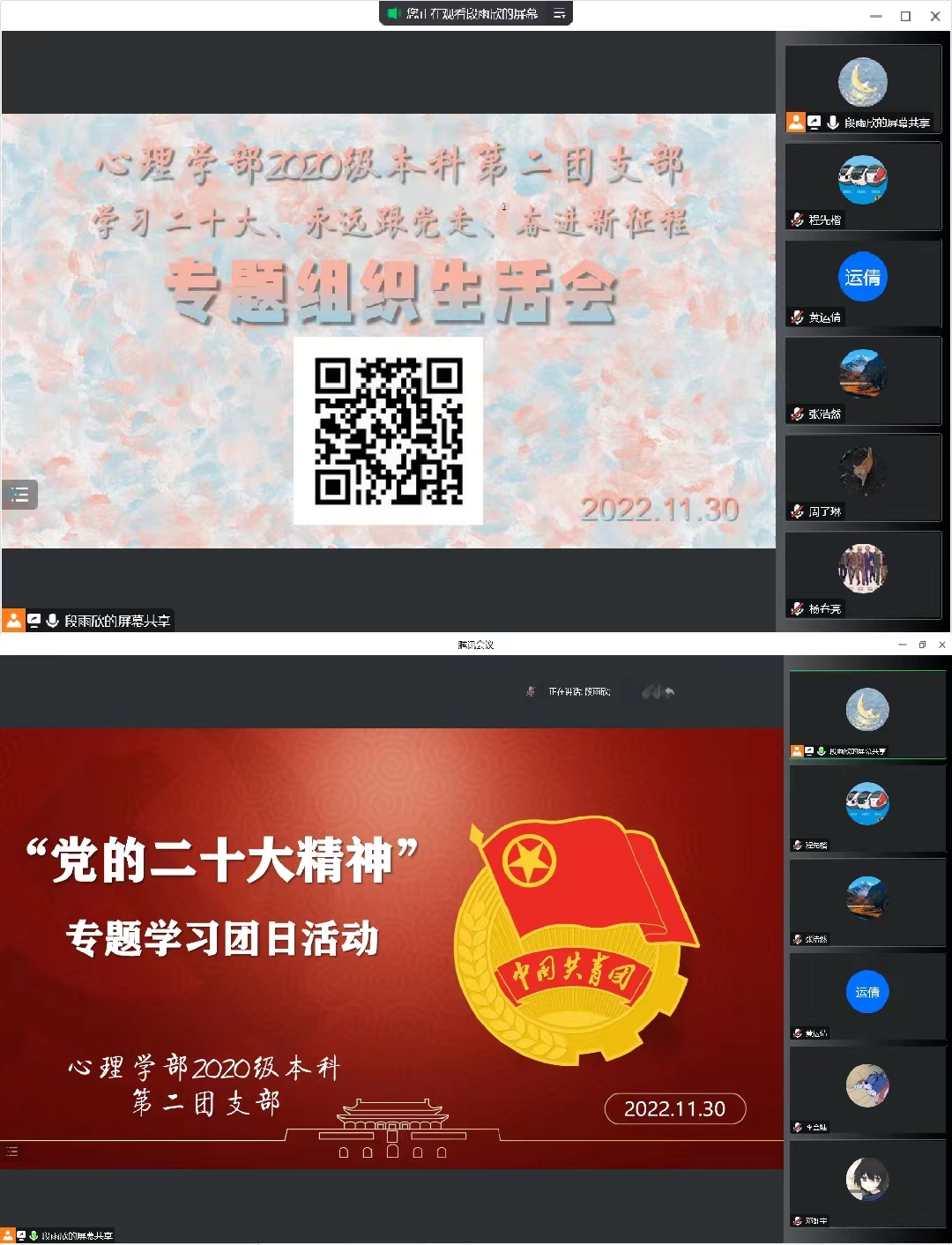 【班级】欧洲杯 2020级本科第二团支部“学习二十大、永远跟党走、奋进新征程”专题组织生活会暨“学习党的二十大精神”主题团日活动顺利召开 为深入学习宣传贯彻党的二十大精神,紧密联系团员思想学习工作实际,交流学习体会、对标先进标准、查找差距不足、激发责任担当,教育引导广大团员坚定不移听党话、跟党走,根据上级组织部署要求,欧洲杯 2020级本科第二团支部于2022年11月30日线上顺利召开了“学习二十大、永远跟党走、奋进新征程”专题组织生活会暨“学习党的二十大精神”主题团日活动,共43名团员参加。会上支部团员们进一步学习了党的二十大精神,对照了团员先进性评价标准,查找自身不足,明确改进方向。