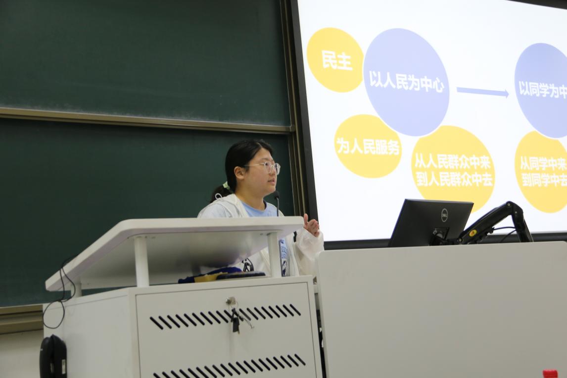 图6 刘佳辉老师介绍团员意识的培养 梁静老师详细介绍了学生会、“心动π”合唱团等学生组织和社会实践与志愿服务项目,鼓励同学们积极加入学生组织、参与学生活动,积累组织协调能力和团队合作经验,同时在社会实践中锻炼自身能力,将所学知识有机地应用到实际问题中,在实践中发挥专业优势回馈社会,为更加充实的大学生活和未来职业发展打下坚实的基础。