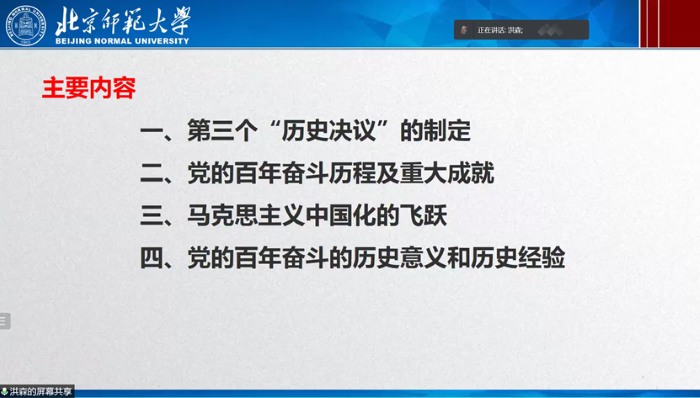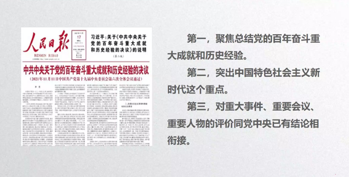 图片 2 讲座的主要内容 首先,刘老师回顾了两个历史决议——1945年《关于若干历史问题的决议》和1981年《关于建国以来党的若干历史问题的决议》的中心思想和历史意义,引出了第三个决议——《中共中央关于党的百年奋斗重大成就和历史经验的决议》,介绍了总书记对决议的三条说明、决议的起草、决议框架、重大意义、中央对决议的定位等。