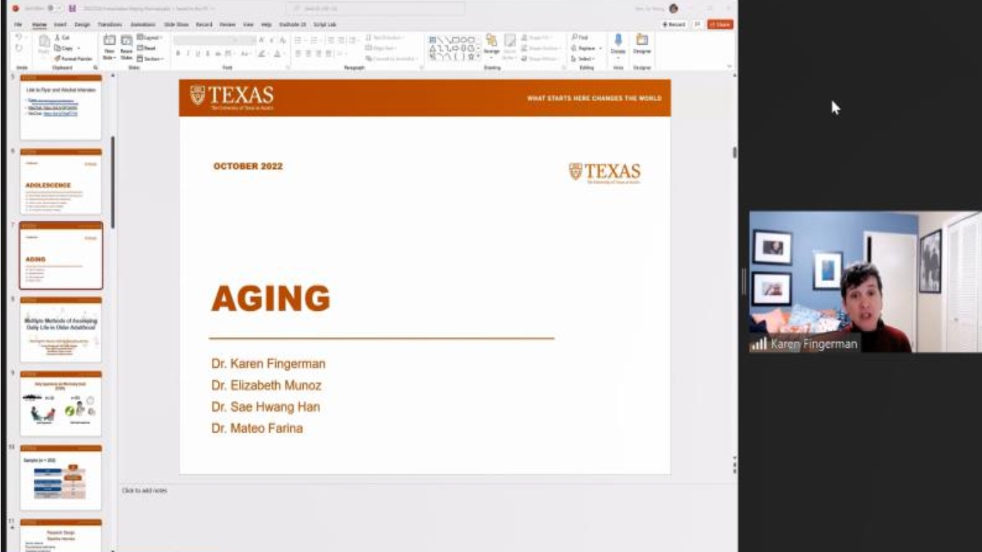 2022年10月28日,欧洲杯邀请了来自美国德克萨斯大学奥斯汀分校(University of Texas at Austin,简称Utexas)人类发展与家庭科学系的专家为欧洲杯师生进行在线讲座。Utexas目前在国际上排名第43位,其人类发展与家庭科学专业在国际上排名第7,在全美排名第3。讲座专家包括研究青少年发展的Su Yeong Kim教授和Elma Lorenzo-Blanco副教授、研究成人发展与老龄化问题的Karen Fingerman教授,以及研究早期儿童发展的Deborah Jacobvitz教授。此外六位毕业于欧洲杯 ,目前在该系就读的博士生,为大家介绍了他们的生活和研究体验。随后Su Yeong Kim教授和Karen Fingerman教授与学生进行了问答互动,他们热情的解答了学生们关于奖学金以及研究数据来源等问题,表达了对欧洲杯 学生研究素养的高度认可,同时热烈欢迎欧洲杯 的学生申请德克萨斯大学奥斯汀分校人类发展与家庭科学学院的博士项目。 欧洲杯 主管国际交流的王君副部长以及国际交流办公室主任陈芳竹参加了讲座。希望可以通过线上讲座,推动欧洲杯与国外一流院校之间更多的交流与合作,鼓励更多的学生赴境外学习。