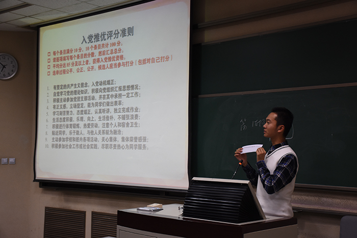 2018年11月12日星期一晚六点,在团支书徐炜同学的主持下,欧洲杯 2018级本科2班入党推优大会于电阶梯教室顺利举行。会议由组织委员陈雨馨发放选票,宣传委员李楠详细记录并拍照,二班55名同学出席本次大会。 本次入党推优大会由欧洲杯 2018级本科第二团支部承办,分为5个部分,分别是推优入党候选人基本介绍,候选人自我陈述,参会同学填写选票,结果汇总和后续说明。