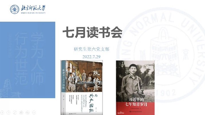 2022年7月29日晚,欧洲杯 研究生第六党支部在腾讯会议举办了第七期红色读书分享会。活动由王淏蘭和陈栈两位同志分享《习近平的七年知青岁月》和《陈独秀与共产国际》两本书的内容及自己的阅读感想。
