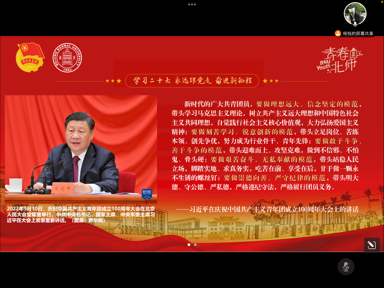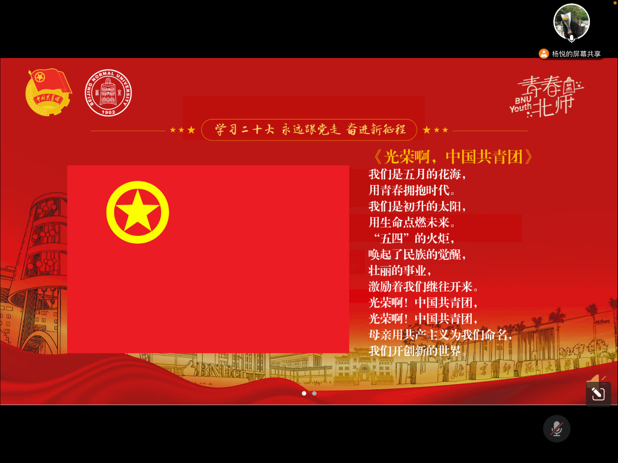 第二项是带领大家线上观看了题为“高举团旗跟党走,青春铸就中国梦”的北京师范大学开展的青年运动主题展。大家了解到了更多关于团的青年运动的历史,尤其是分的五个章节,让我们更加全面的认识到了从20世纪起的青年运动先进事迹。