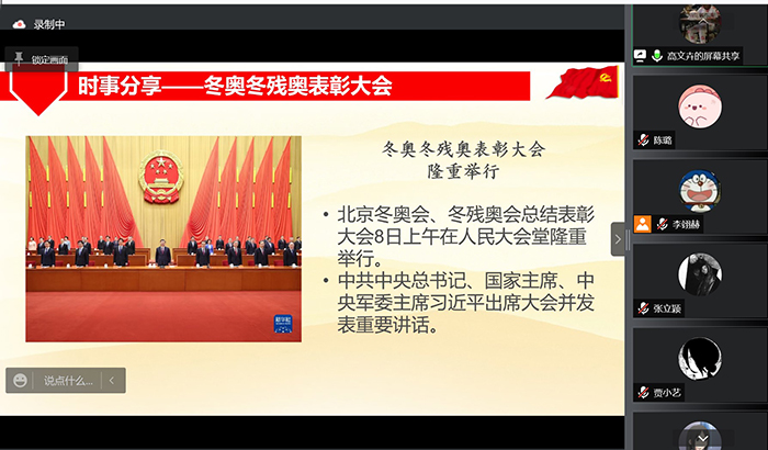 针对新冠溯源问题,有同志认为,我们应当从中意识到该怎样正确利使用技术,无论是生物技术,还是心理知识。同时,也有同学认为美国的行为有点“此地无银三百两”的意味。针对新冠病毒的扩散,我们能做的是做好当下。 对于冬奥冬残奥会表彰大会,有同志认为大家对残奥会关注的比较少,但残奥会上的精神十分感人,值得我们学习。 对于上海疫情,几位同志分别从人权、各国实际情况等角度讲述了中国为什么不能向西方一样全面放开。有同志提出,在自己没有足够的心理调节能力时可以少看一些痛感新闻,避免替代性创伤,在保护好自己的前提下去帮助别人。 在本次时事分享会中,大家分享了疫情近况和冬奥冬残奥会。同志们积极表达了自己对时事的思考与感悟,收获颇丰。本次党小组会圆满结束。 本科生第一党支部 供图:陈璐 供稿:陈璐、易振南
