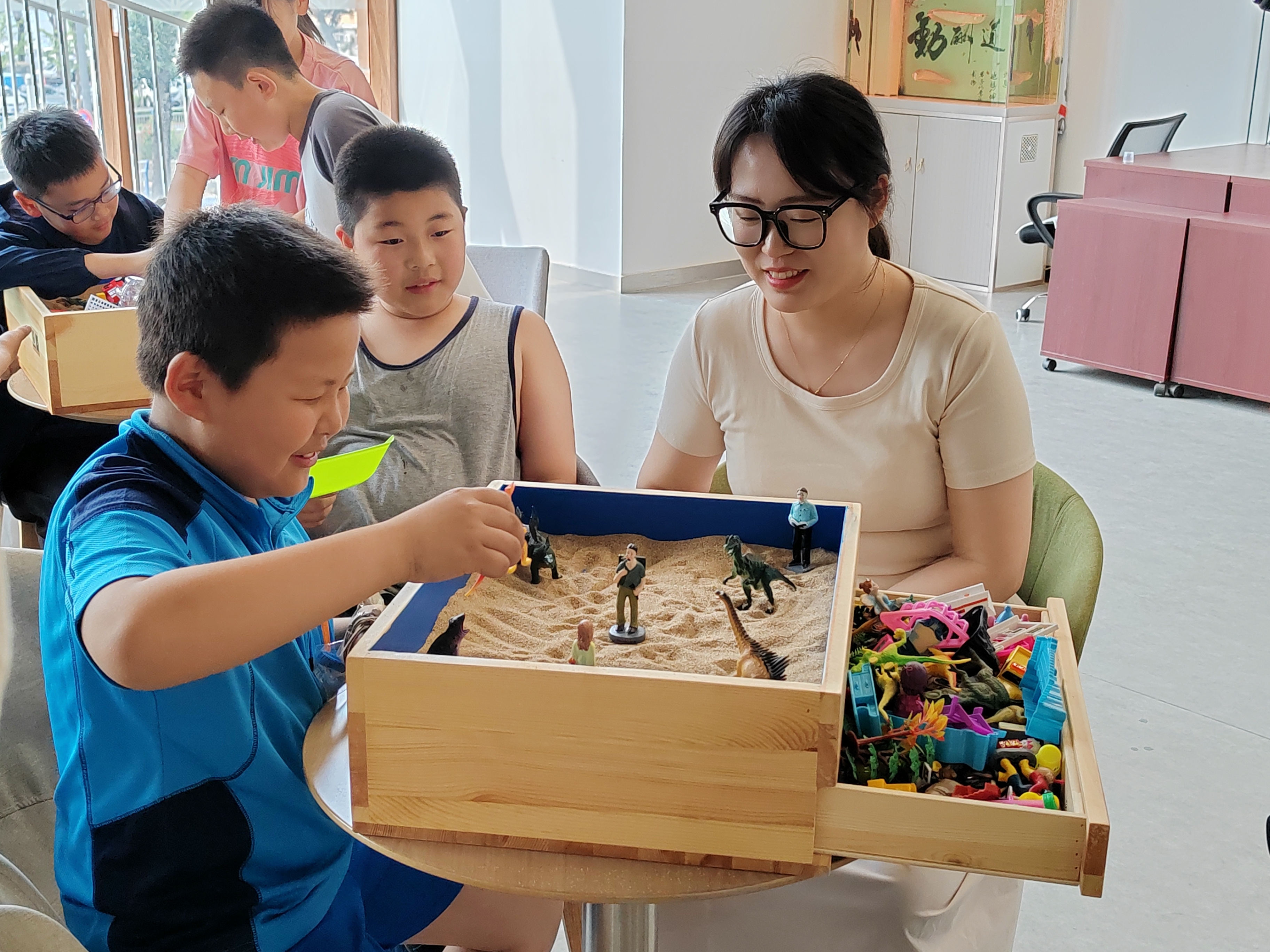 本次活动还特别邀请了北京师范大学临床与咨询心理硕士、CPS中国心理学会注册系统注册心理师 (X-22-073)、国家三级心理咨询师孙杨柳老师为电厂路小学10-12岁的小同学们开设箱庭体验活动,让小同学们了解了箱庭在心理咨询中发挥的作用,并亲身体验了箱庭过程。