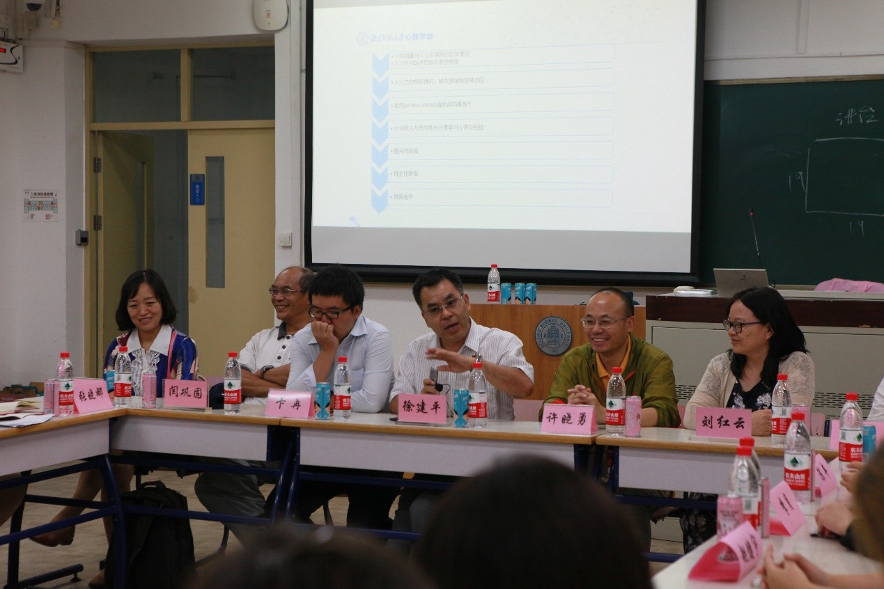 图4 测量所的老师们各自介绍自己的研究领域,MAP中心的老师介绍接下来的课程安排 黎坚老师对本方向即将开始紧张学习生涯的专硕新生说,实验心理学、心理统计学、心理测量学是BNU-MHR必备技能,要想在这个领域学有所成,必须将这三门研究方法课的基础打扎实。尤其是基础薄弱、以及那些非心理学背景的学生,更应重视,挤时间加强学习。 随后,三名2016级的师姐李月、赵健宇、陈丰就新生们感兴趣的话题 “如何平衡学习与工作?”“跨专业考生如何跟上紧张的学习节奏?”发表了自己的经验之谈,希望为学弟学妹排忧解惑。