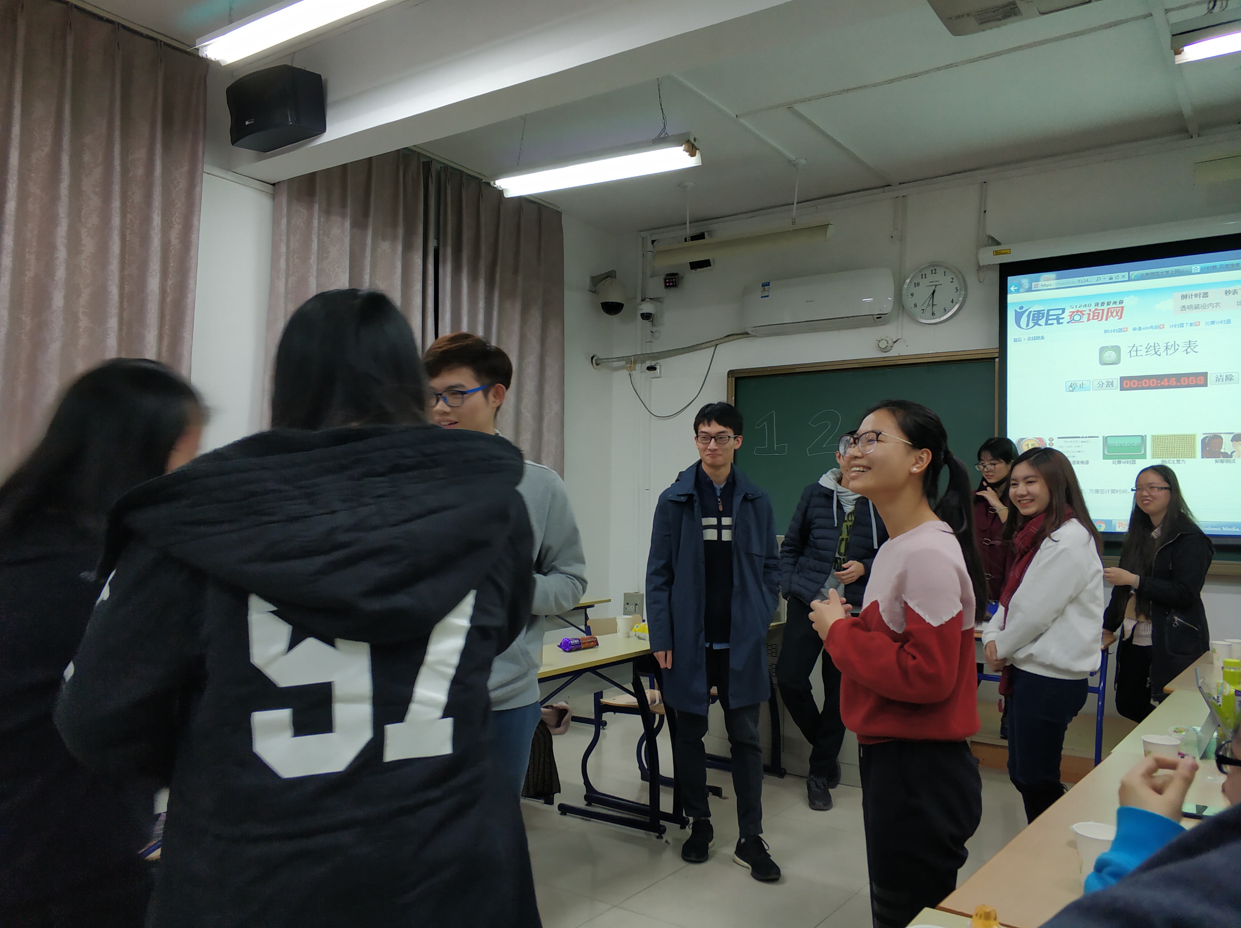 活动开始,首先进行了N秒不NG游戏,三组同学依次作为挑战方与防守方完成了①配制饮料②猜拳③指左看右④绕口令四个小节,并按照完成时间排出了名次。