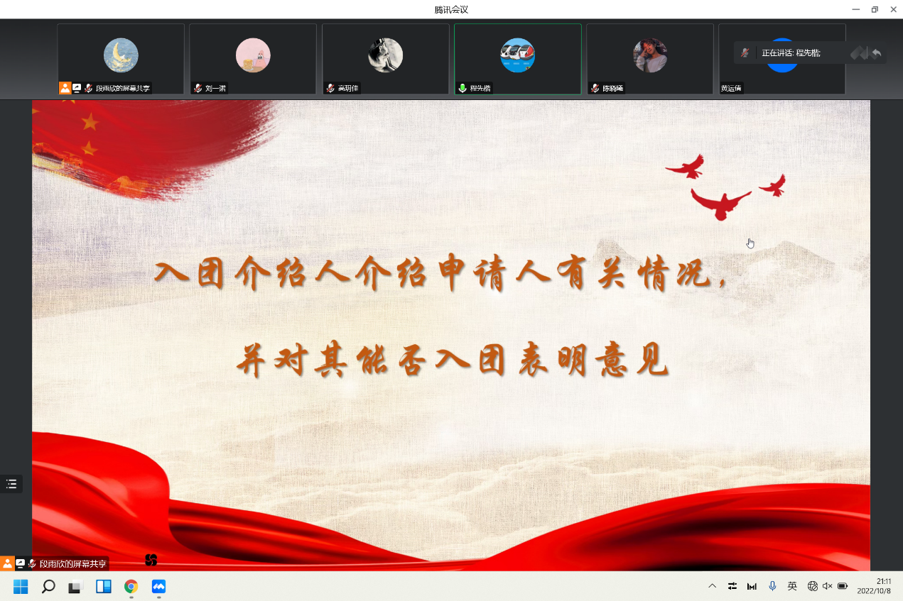 2022年10月8日,经上级团组织同意,2020级本科第二团支部于线上召开了关于是否接收高玥佳同学为共青团团员的支部大会,大会由支部书记段雨欣同学主持。