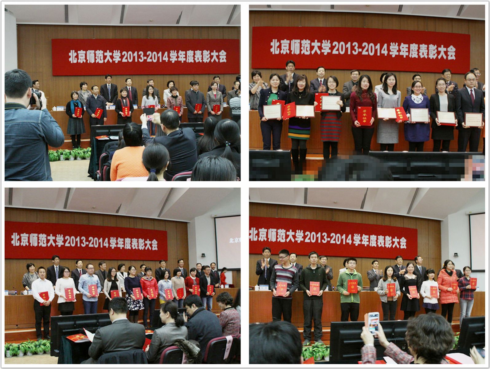 12月30日下午,学校2013—2014学年度表彰大会在英东学术会堂隆重召开。党委书记刘川生、校长董奇等校领导出席大会。我院姚梅林教授作为“十佳师德标兵”、分党委副书记王瑞敏老师作为“学生工作先进个人”、2012级班主任曹昌健老师作为北京师范大学“十佳辅导员”、2011级本科生苗芃作为国家奖学金获奖代表分别上台领奖。 以下为获得学校表彰的先进集体及个人。 一、教师先进集体及个人 姚梅林老师获评“十佳师德标兵”荣誉称号; 彭华茂老师获评“励耘奖学基金(优秀教师)二等奖”; 胡清芬老师获评“通鼎青年教师奖(本科教学奖)”; 心理学院在院系学生工作考评中被评为“学生工作先进集体”; 分党委副书记王瑞敏被评为“学生工作先进个人”; 分团委书记曹昌健老师获评首都“先锋杯”优秀基层团干部; 2012级本科生班主任曹昌健老师获评北京师范大学“十佳辅导员”、“优秀辅导员”; 2011级本科生班主任解妍获评“优秀辅导员”。 二、学生先进集体及个人 心理学院2012级师范班获评北京市先进班集体、北师大一等优秀班集体; 心理学院2012级非师范2班获评北师大一等优秀团支部; 心理学院2013级2班等4个班级获评北师大二等优秀班集体; 心理学院2012级非师范1班等4个班级获评北师大二等优秀团支部; 心理学社获评北师大二等优秀团支部; 心理学院2012级博士班、2013级应用心理硕士班获评北师大先进班集体; 本科生第二党支部获评京师先锋号党支部二等奖; 学十二楼410等8个本科生宿舍获评文明宿舍; 2011级非师范班团支书苗芃荣获了首都“先锋杯”优秀基层团干部; 陈美玲获评北京市三好学生; 闫子临、左世江(硕)获评华为奖学金; 张博(硕)、何丽(博)获评通鼎优秀研究生奖学金; 黄真真、肖红蕊(硕)、黄雅梅(博)获评励耘奖学金; 马洁、门金泽(硕)获评京师校友金声奖; 庄丹琪(硕)获评合利屋社会实践奖学金; 苗芃等17人获评国家奖学金; 方昱沣等12人获评国家励志奖学金; 陈品儒等168人获评京师奖学金; 郭海英等56人获评研究生优秀学业奖学金; 姚远维等2人获评学术奖学金; 全然等6人获评竞赛奖学金; 周诗怡获评京师先锋党员; 毛晓飞(硕)获评优秀国防生; 向志圆等3人获评优秀免费师范生; 万薇洁等27人获评三好学生; 刘欢等16人获评优秀学生干部; 文雯等25人获评优秀团员; 张鑫等3人获评社会实践单项奖; 陈基越等28人获评社会工作单项奖; 鹿飞宇等4人获评文体之星单项奖; 李超等8人获评志愿服务单项奖; 濮冰燕等7人获评研究生社会实践奖学金; 朱亿萧等13人获评优秀研究生干部。