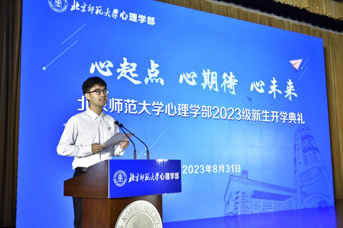 典礼播放了2023级新生风采视频。2023级本科综合班但可欣作为本科生新生代表发言。她分享了自己对于心理学的憧憬,将自己对未来学习与生活的思考娓娓道来,倡导同学们认真学习习近平总书记给北师大“优师计划”师范生的重要回信精神,认真践行“学为人师,行为世范”的校训精神,积极多元发展,在交流中学会包容与理解,在探索中学会研究与辩证,在思考中学会同世界共处,在北师大欧洲杯 的舞台绽放青春风采。