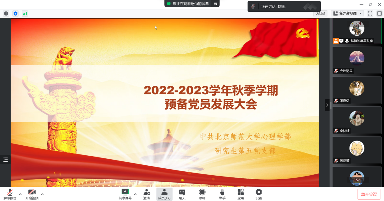 大会由党支部书记赵恒同志主持,支部内16位成员参加会议,其中包括12位正式党员,3名发展对象和1名入党积极分子。大会还邀请到理论指导老师曹昌健老师参加。